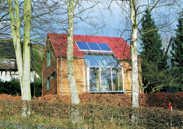 Ein recht kleines Haus mit nur ca. 115 m² Wohnfläche, das aber einiges zu bieten hat: ein integrierter Wintergarten, natürlich mit Dreifach-Verglasung, in dem man Licht tanken kann, daneben ganz geschützte Zonen, um es sich z.B. vor dem Pelletofen gemütlich zu machen, oben eine kleine Empore zum Wintergarten und Räume, die bis in die Dachspitze offen sind. Das Gefüge des Hauses lässt sich im Inneren an der klaren, sichtbaren Holzstruktur ablesen.